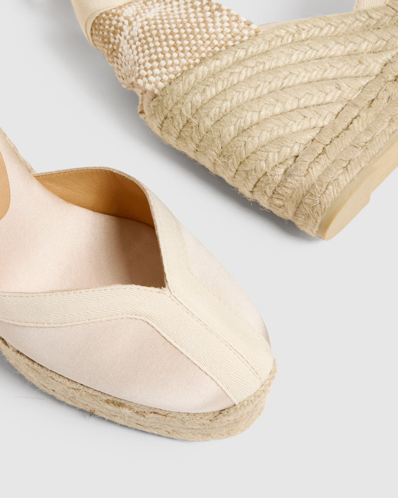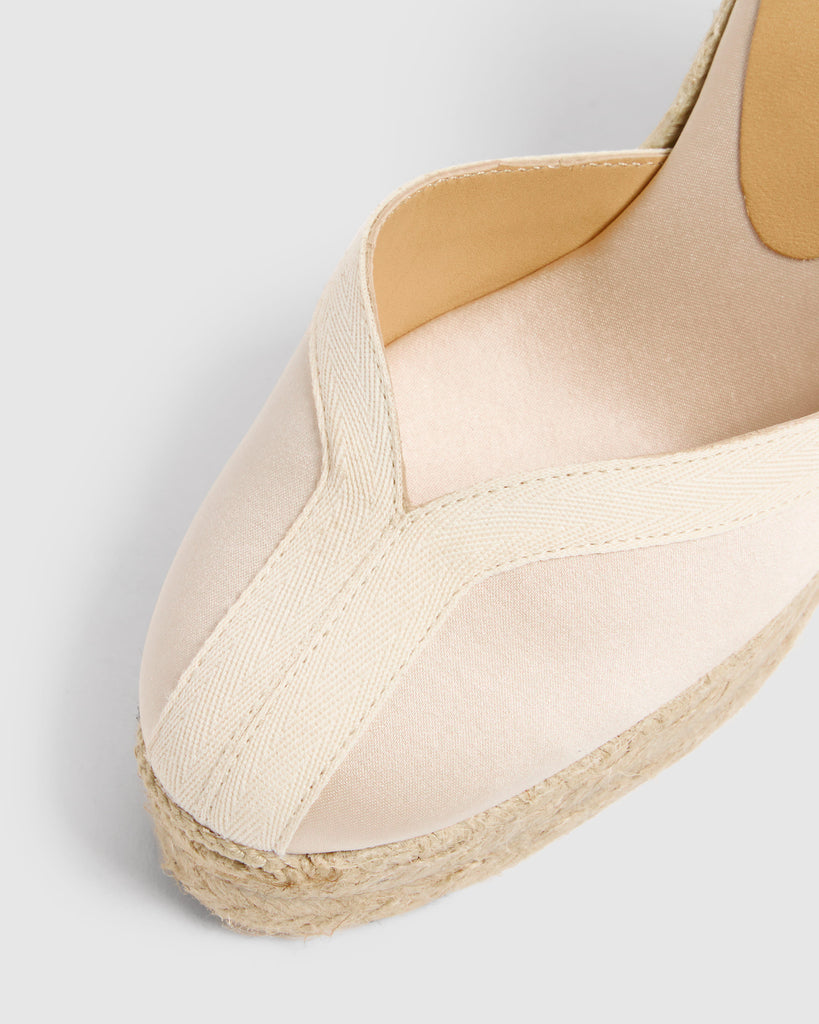 Alpargata con cuña elaborada en raso. Diseño con escote en V. Talonera en tejido trenzado. Cierre con doble cinta al tobillo. Puntera redonda.