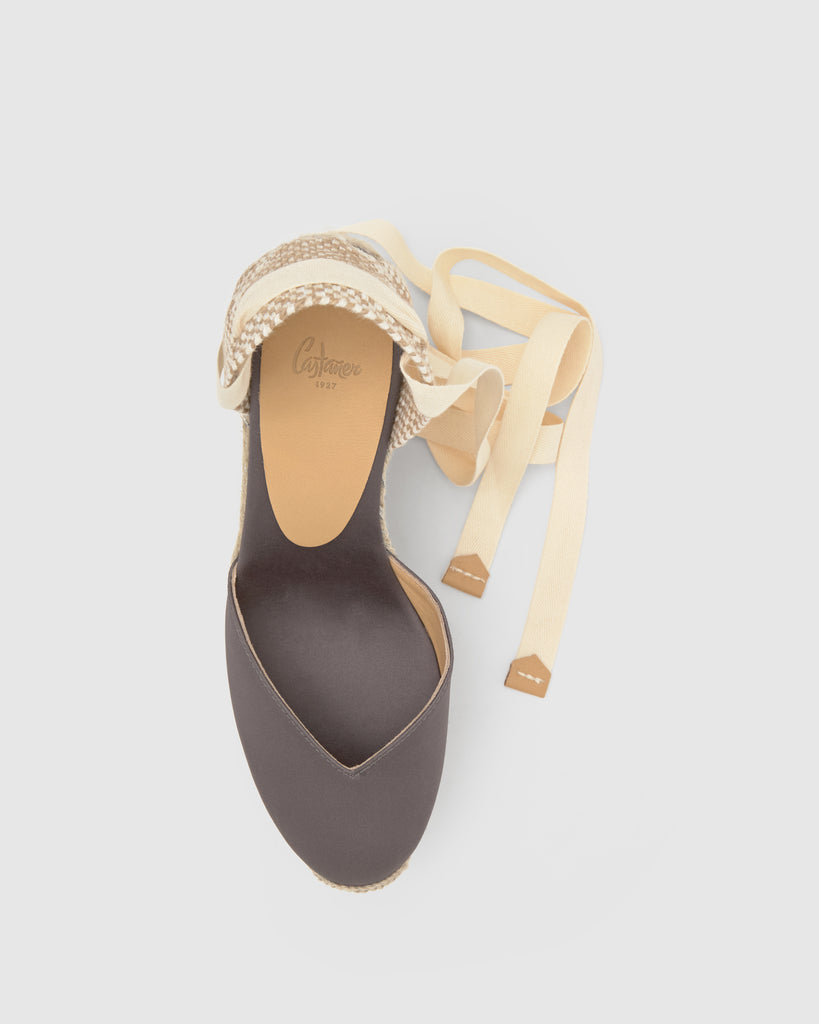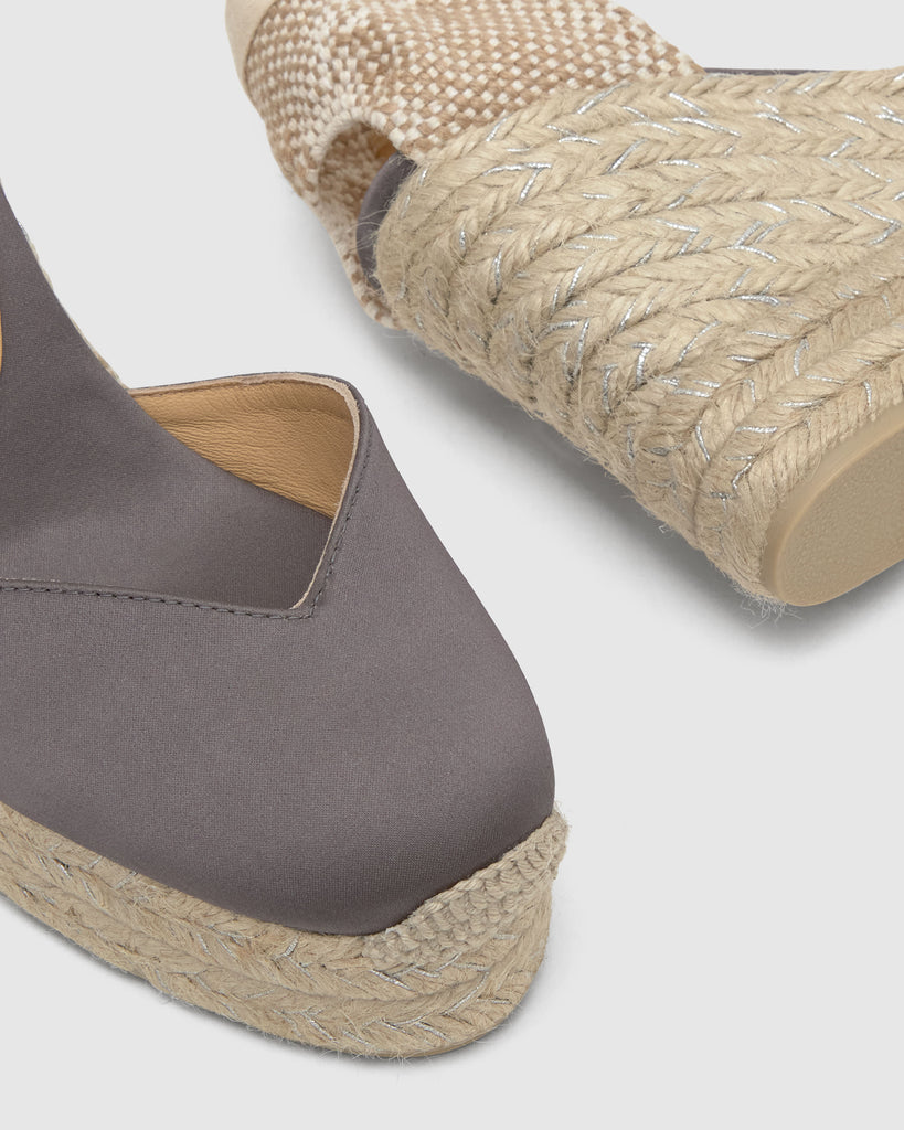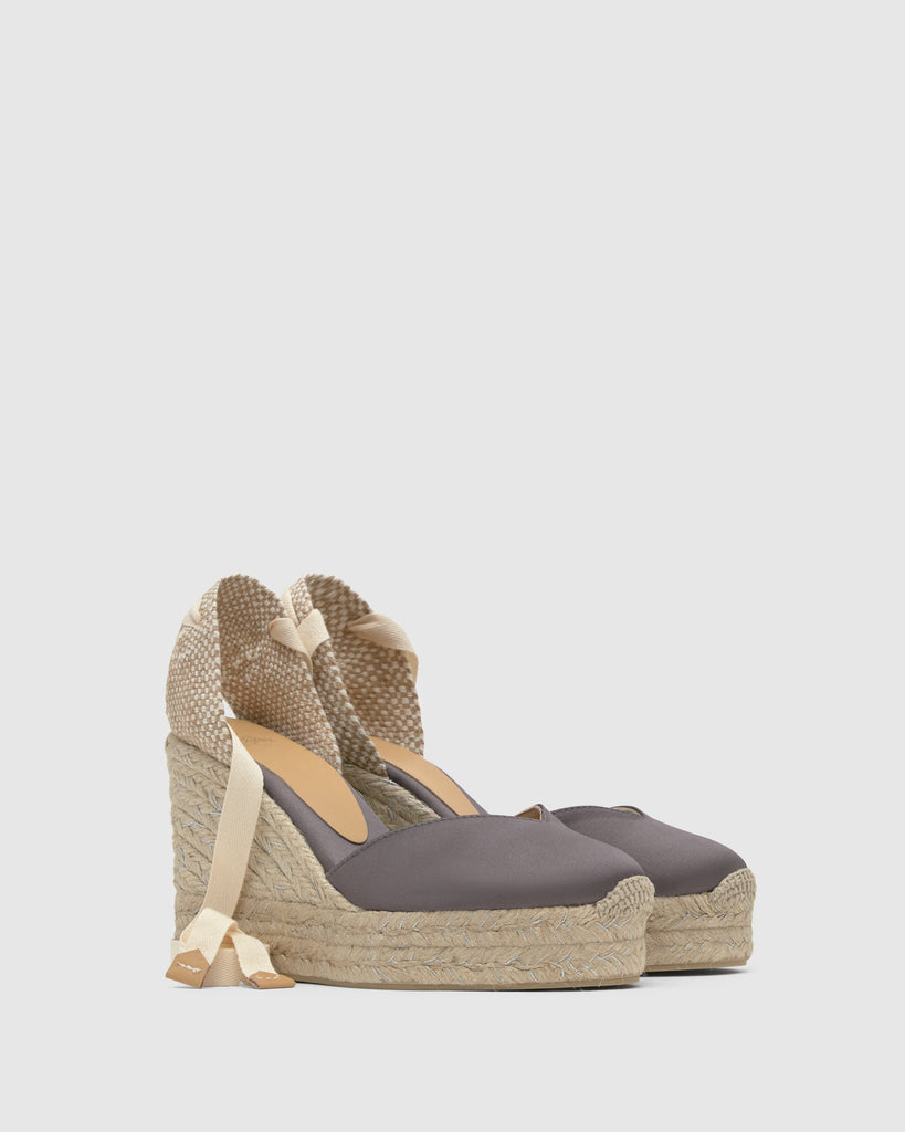 Icónica alpargata Chiara en raso con cierre de cintas, plantilla acolchada y escote en V. Cuña de yute de 11cm con doble plataforma.