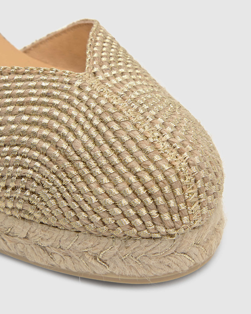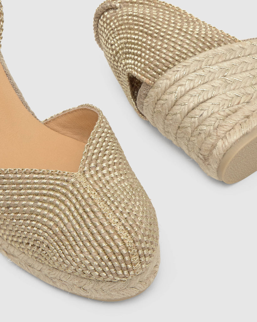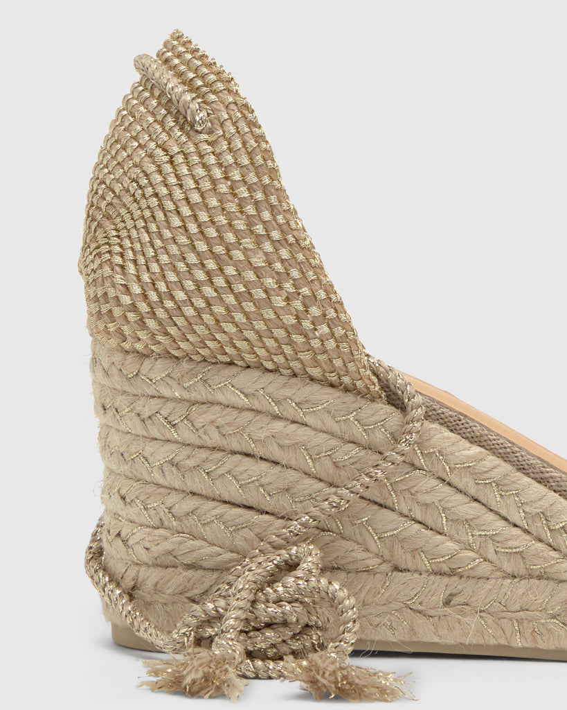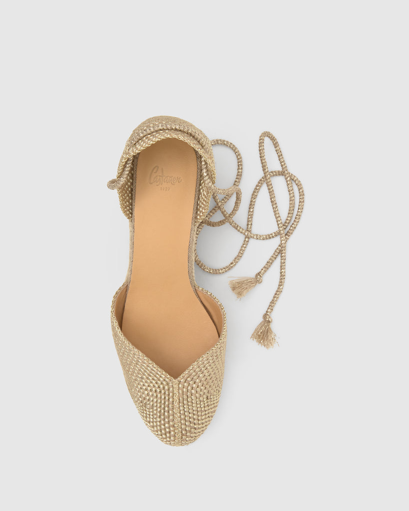 Alpargata Cora en yute y rayón con cierre de cintas, plantilla acolchada y cuña de 7 cm.