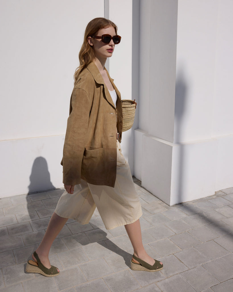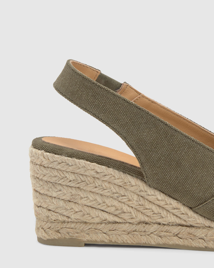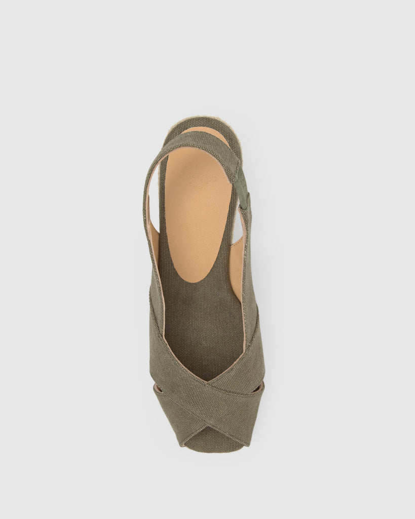 Alpargata destalonada Diana estilo peep-toe en algodón orgánico lavado con plantilla acolchada y cuña de yute de 7cm.