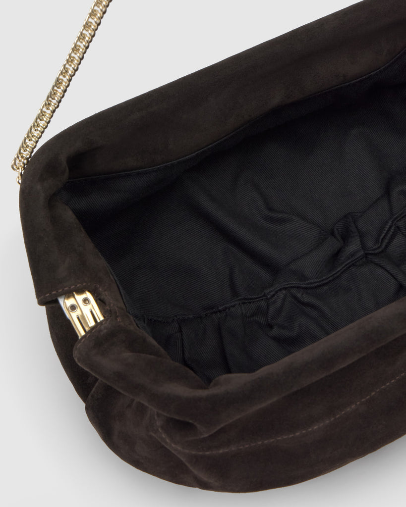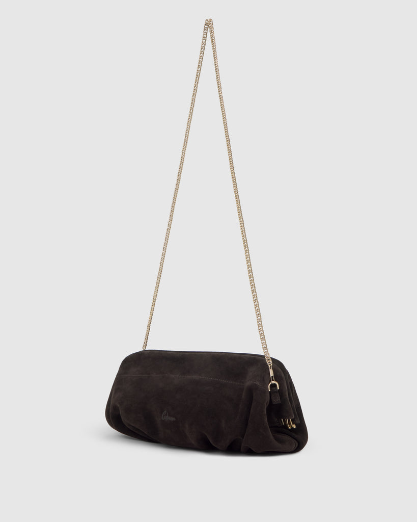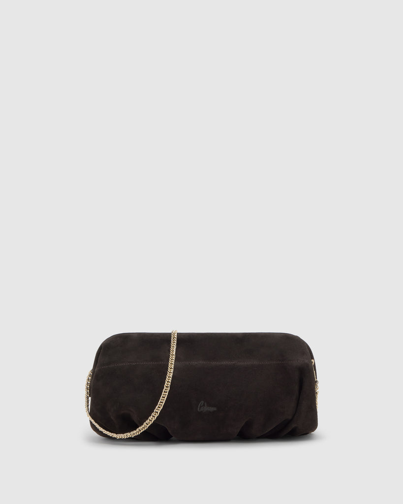 Bolso Big Victoire tipo pochette en serraje con cierre de click y cadena dorada extraíble.
