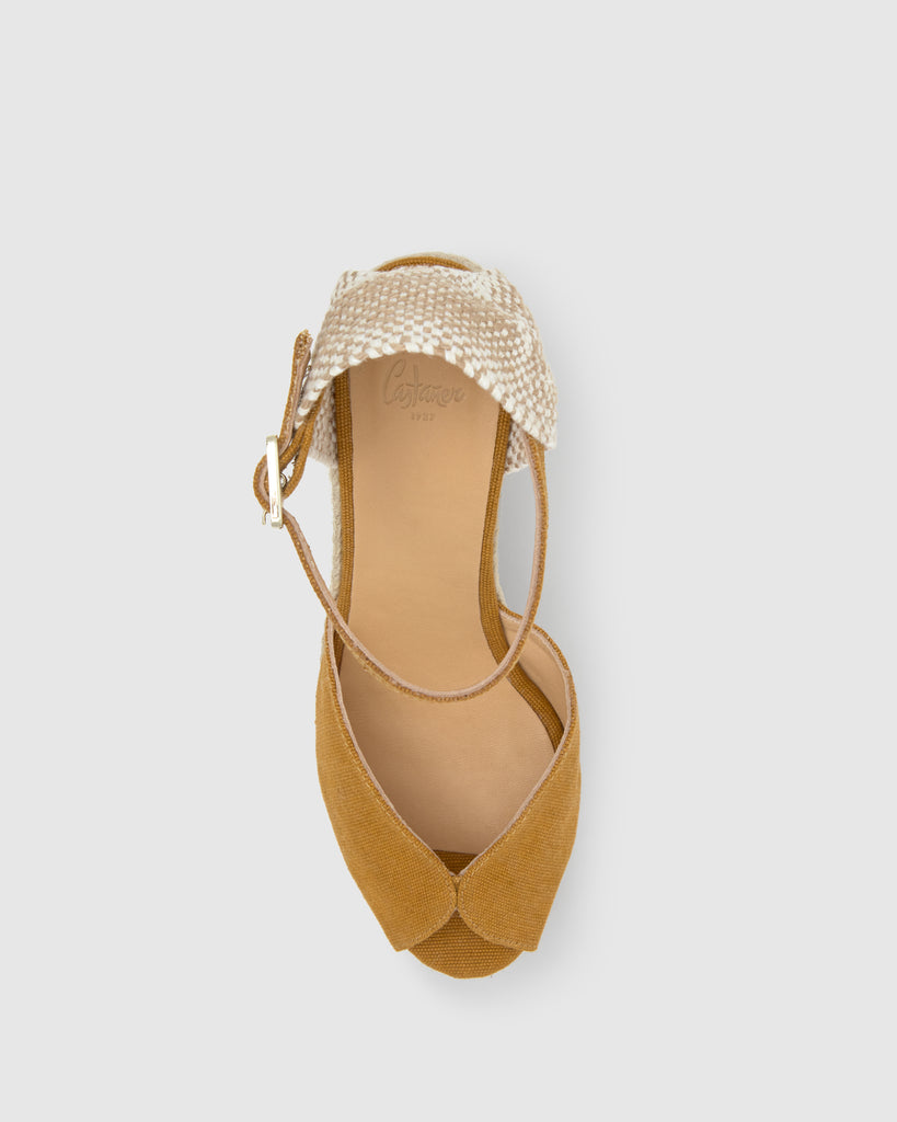 Sandalia Bianca estilo peep-toe en algodón orgánico lavado con cierre de pulsera, plantilla acolchada y cuña de yute de 11cm con doble plataforma.