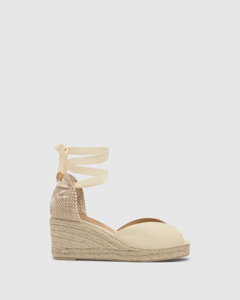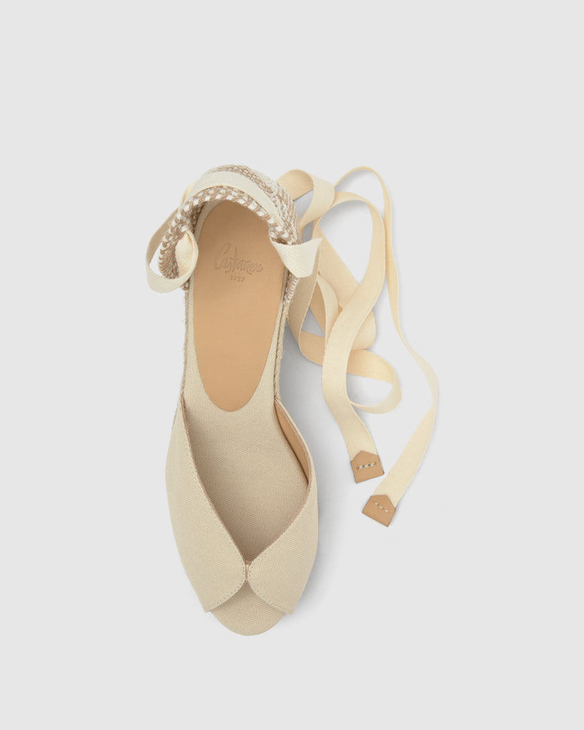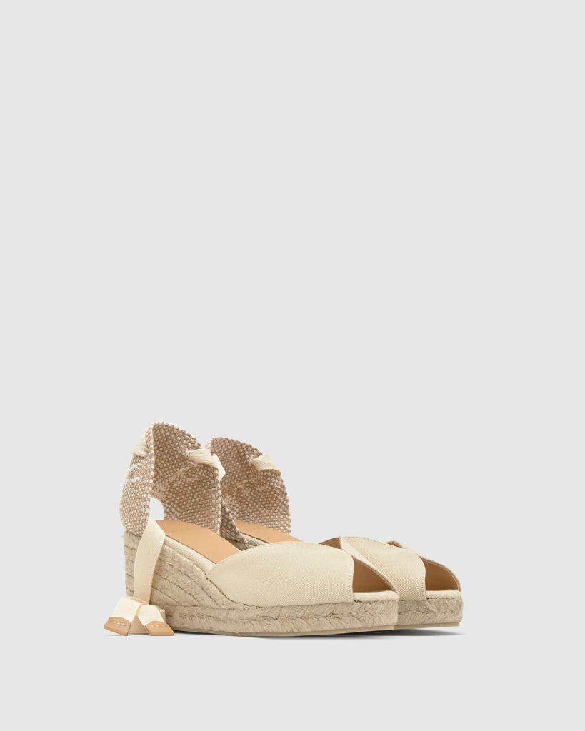 Sandalia Bilina estilo peep-toe en algodón orgánico con cierre de cintas, plantilla acolchada y cuña de yute de 7cm.