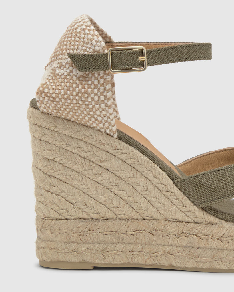 Sandalia Bruna en algodón orgánico lavado con cierre de pulsera, plantilla acolchada y escote en V. Cuña de yute de 11cm con doble plataforma.