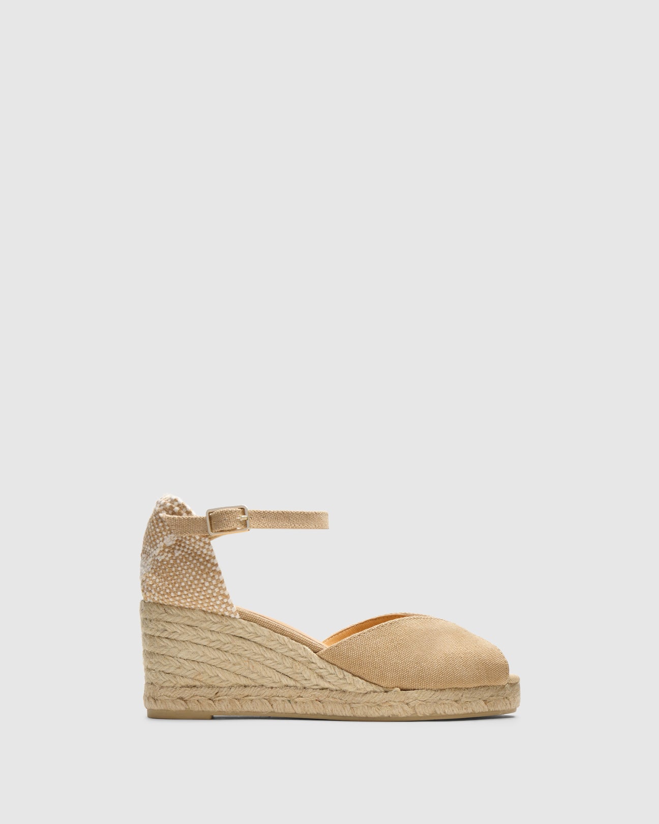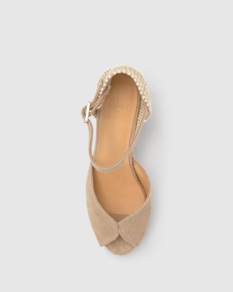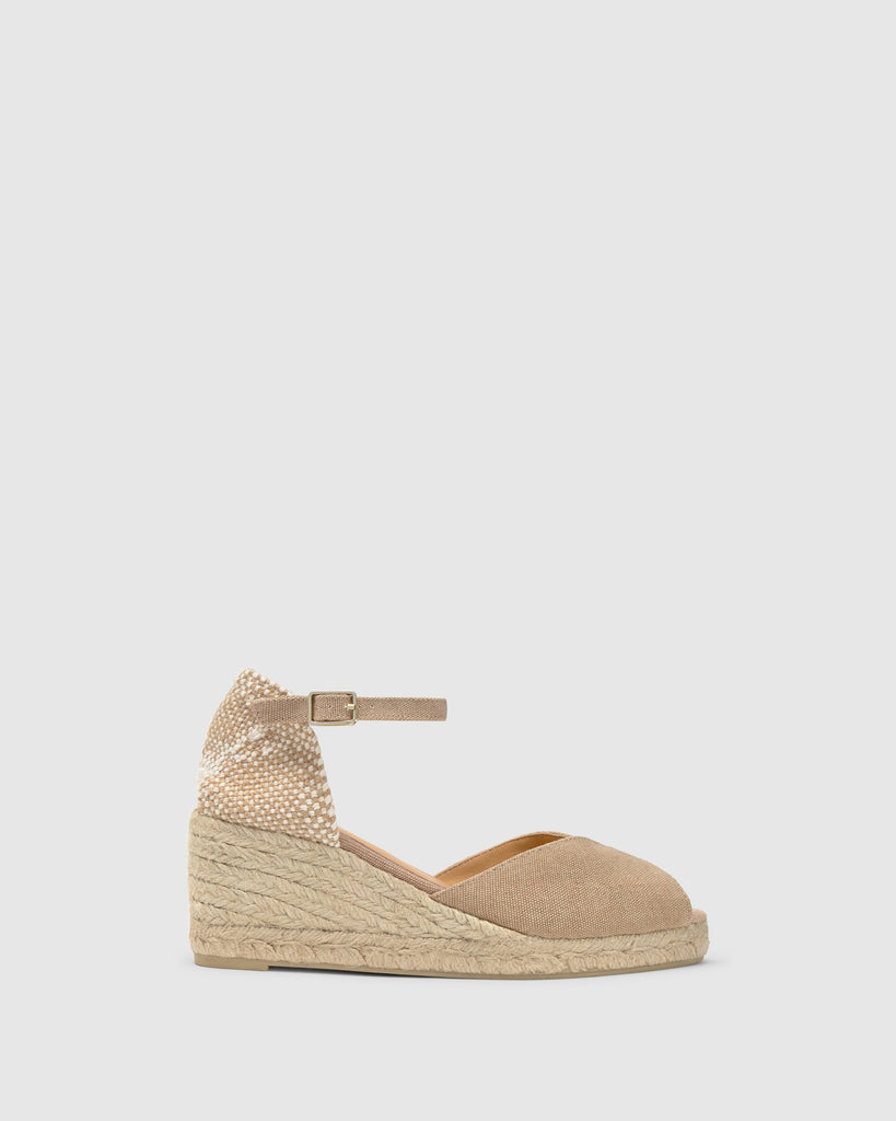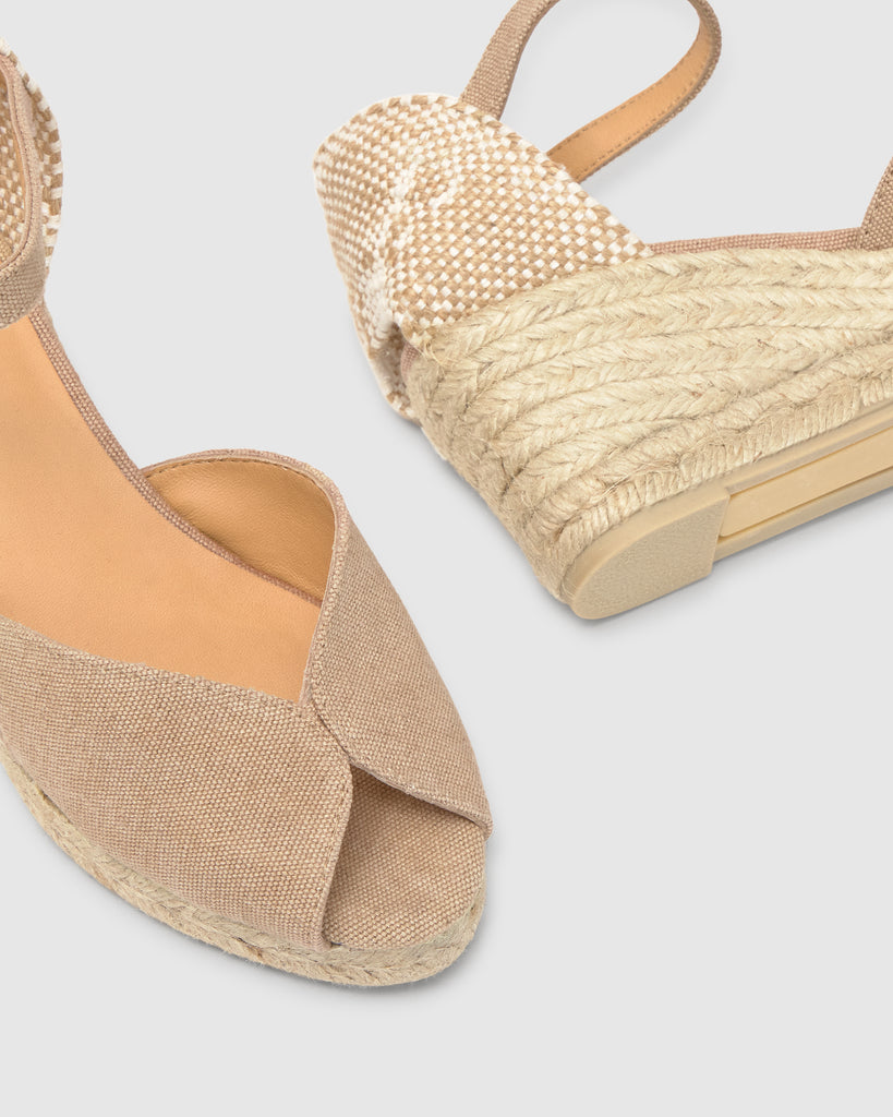 Sandalia Bianca estilo peep-toe en algodón orgánico lavado con cierre de pulsera, plantilla acolchada y cuña de yute de 7cm.