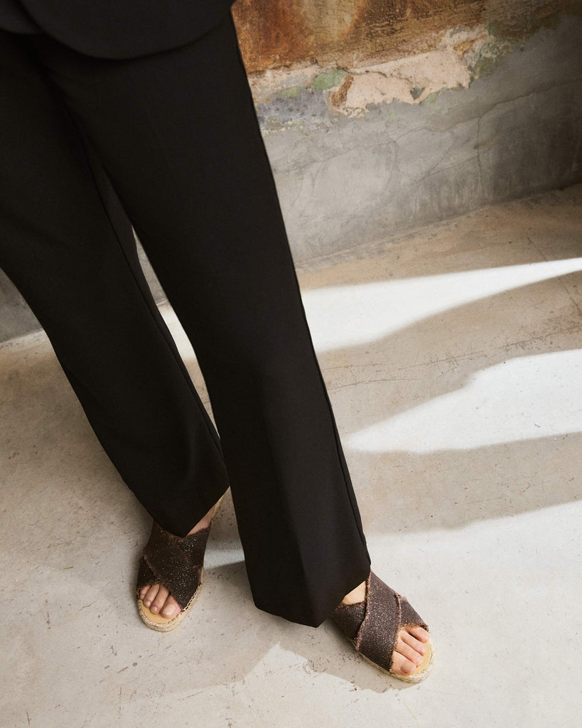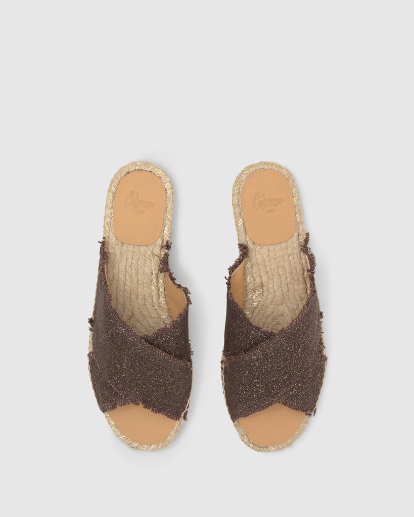 Sandalia plana slip-on Palmera en lino metalizado con corte cruzado, un divertido desflecado y suela de yute y lurex.