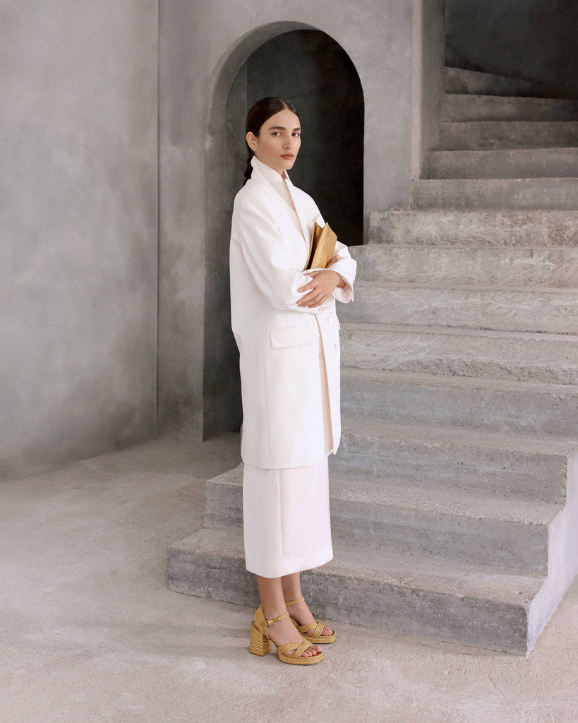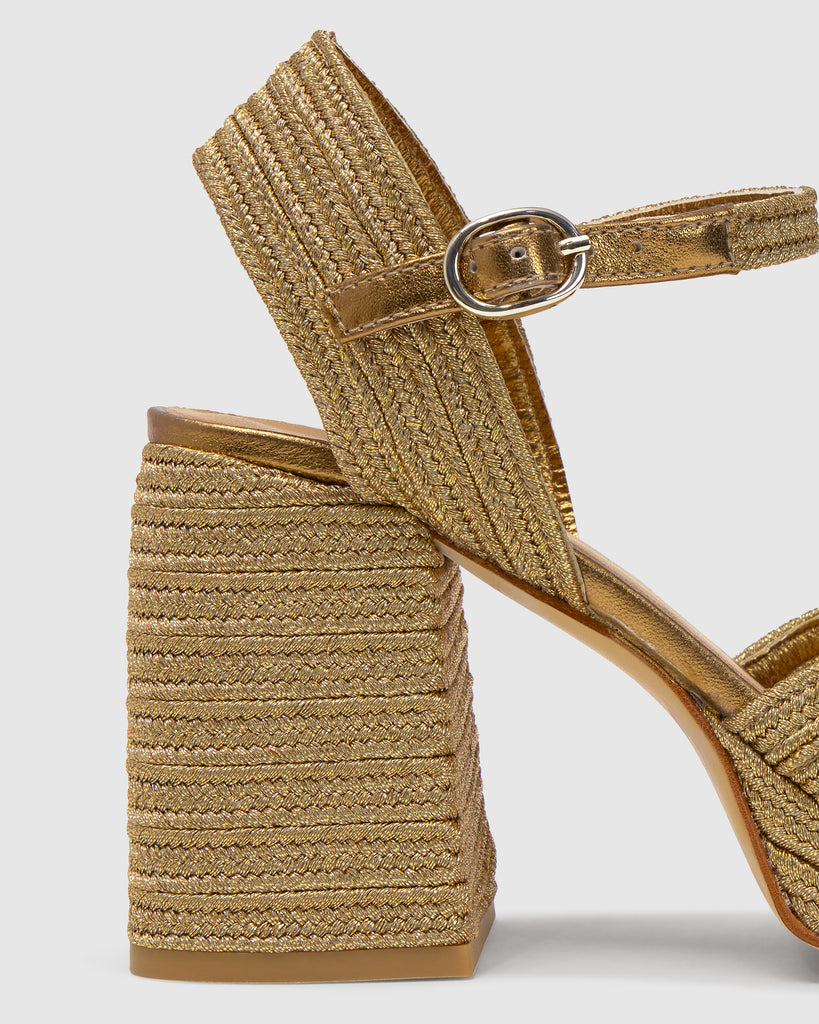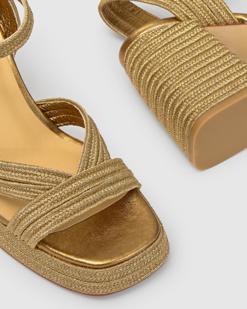 Icónica sandalia Valle con trenzado metalizado artesanal, cierre de pulsera, plantilla acolchada y escote en V. Tacón de 10 cm forrado a juego.