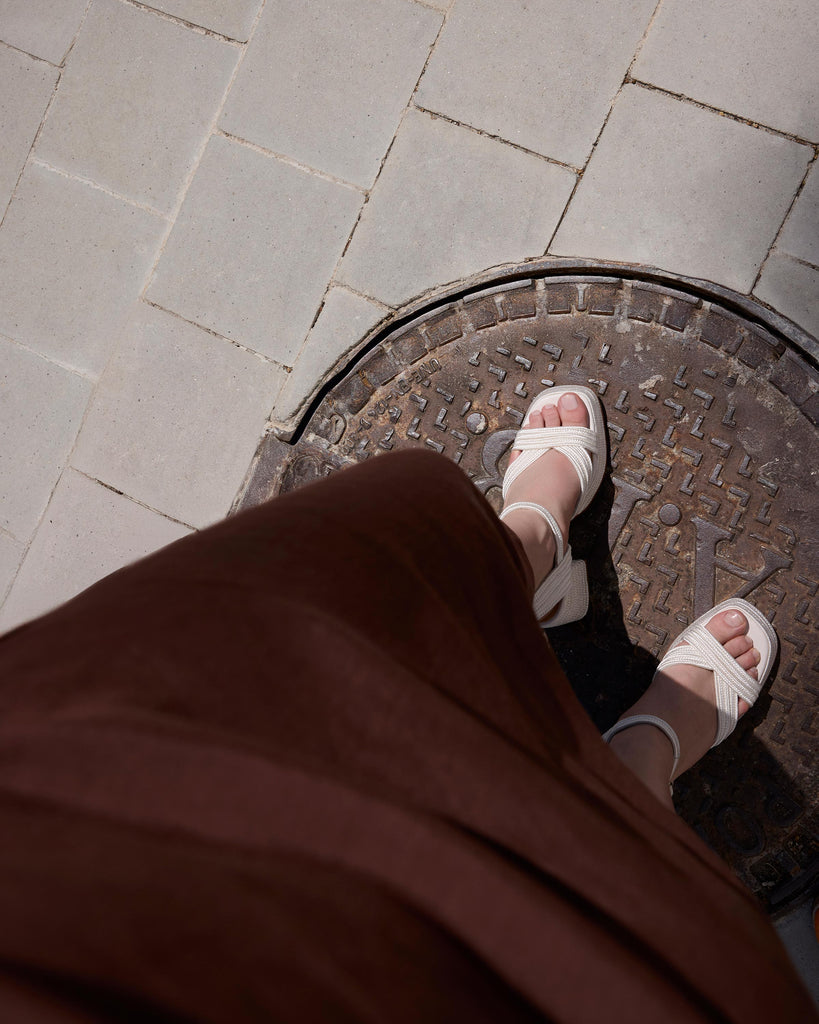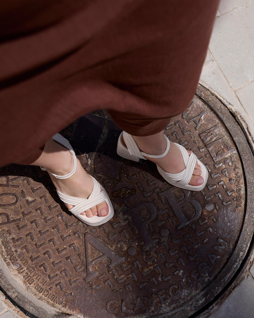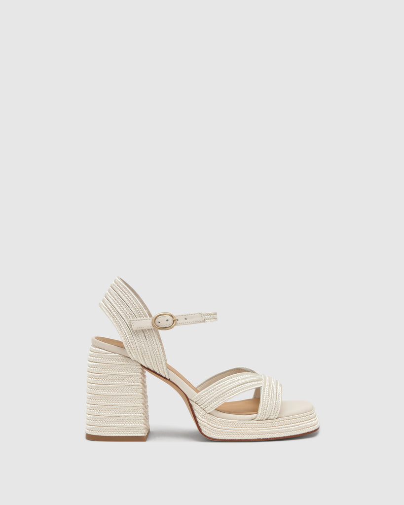 Icónica sandalia Valle con trenzado metalizado artesanal, cierre de pulsera, plantilla acolchada y escote en V. Tacón de 10 cm forrado a juego.