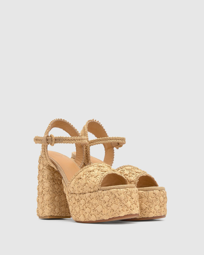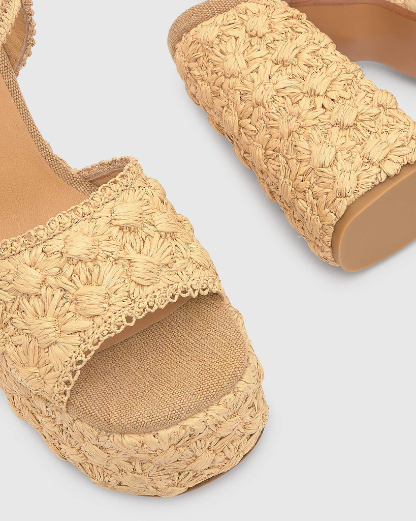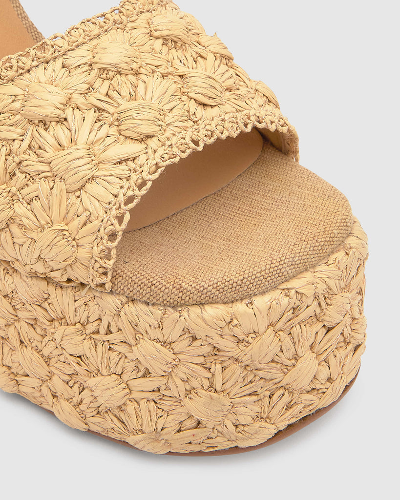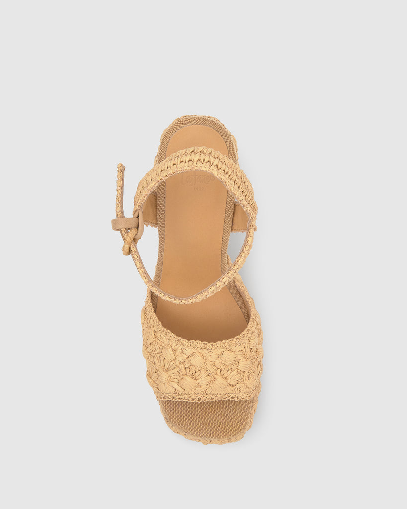 Sandalia Fabiana completamente forrada en un excepcional bordado artesanal de rafia natural con motivos florales. Cierre de pulsera, plantilla acolchada y tacón de 13cm.