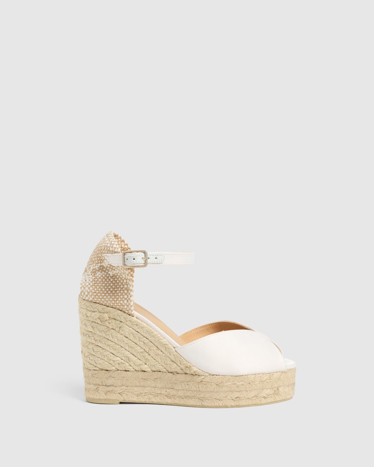 Ensalza tus looks con nuestras alpargatas Bianca, un estilo único que derrocha personalidad propia. Confeccionadas en españa artesanalmente en raso, las alpargatas bianca se convertirán en tus mejores aliadas para el día a día. Presentan puntera abierta redondeada, cierre lateral de pulsera con hebilla metálica, cuña de 11cm con doble plataforma de yute y suela de caucho vulcanizado.